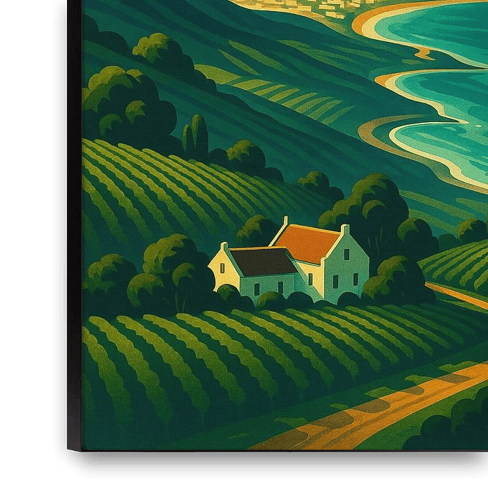 Bestelle dieses Landschafts-Wandbild Südafrika Art Deco Poster - Tafelberg und Küstenweinberge von Travel Shop als Reproduktion auf Leinwand, Alu-Dibond, als Poster, Fototapete oder Acrylglasbild.