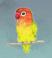 Eine Aquarellzeichnung einer niedlichen gelben Pfirsichköpfchen. Er sitzt bequem auf einem Stock. Diese Farbmutation wird auch als Lutino bezeichnet.