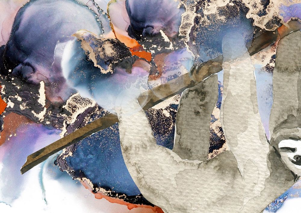 Ein gemütliches Faultier hängt an einem Ast, umgeben von kräftigen Farben.
