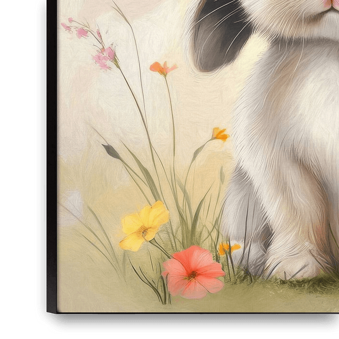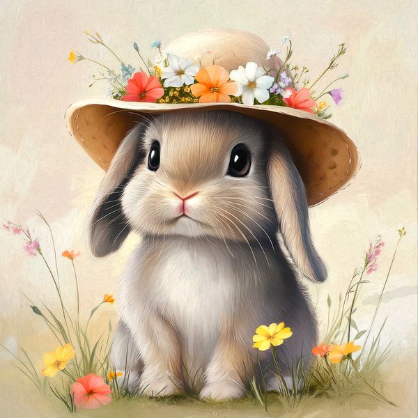 Ein flauschiges Kaninchen mit einem Strohhut, der mit bunten Blumen geschmückt ist, sitzt inmitten einer blühenden Wiese und verströmt eine charmante und verspielte Atmosphäre.