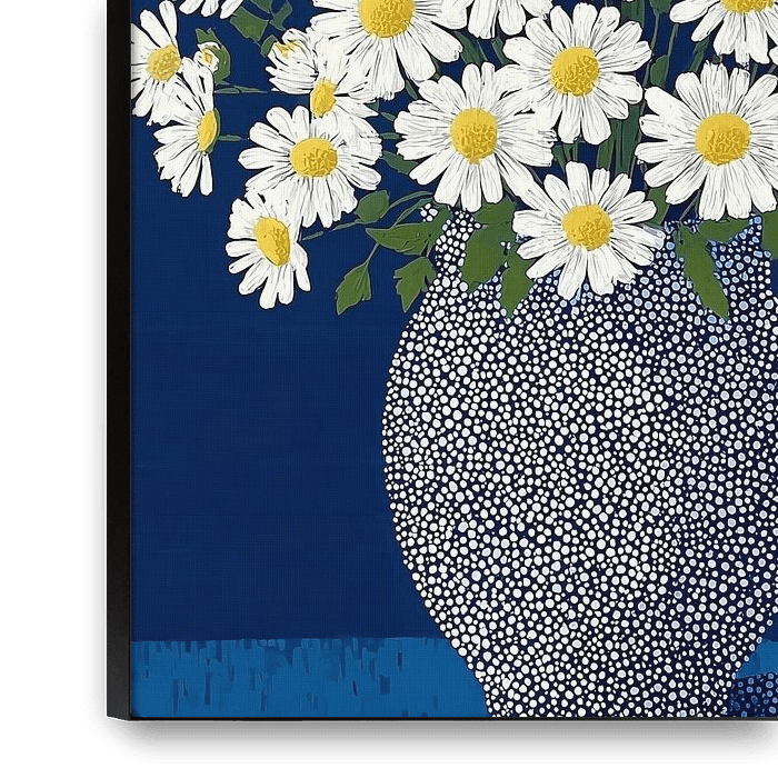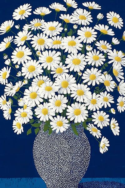 Ein üppiger Strauß Margeriten füllt das Bild bis zu den Rändern aus, als ließen die Blumen keinen Raum mehr für Stille. Weiße Blütenblätter fächern sich verspielt um sonnengelbe Herzen, die wie kleine Lichtquellen vor einem tiefblauen Hintergrund leuchten. Die Farbkontraste sind kräftig und klar: Das intensive Blau verstärkt das frische…