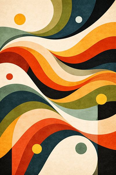 Fließende abstrakte Wellen, inspiriert von den Farbpaletten der 70er Jahre, schaffen einen ruhigen und dennoch lebendigen visuellen Rhythmus. Erdige Grüntöne, gebranntes Orange und warme Beigetöne vermitteln nostalgische Wärme und organische Bewegung. Ein perfektes Statement-Kunstwerk für Interieurs im Mid-Century-Stil, gemütliche…