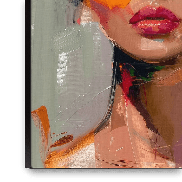 Super buntes, modernes und abstraktes Porträt einer jungen Frau mit Farbstreifen im Gesicht. Ein besonderer Blickfang für Ihr Interieur! Für alle, die Farbe lieben! Erhältlich in Lila, Orange, Rosa, Grün und Ockergelb.
