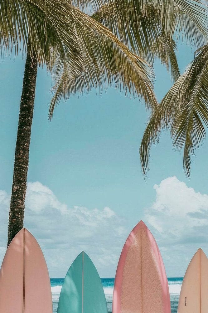 In einem Paradies aus Sonne und Sand reihen sich sanft pastellfarbene Surfbretter aneinander, umarmt von prächtigen Palmen, die im warmen Wind wiegen. Der azurblaue Himmel spiegelt sich im sanften Glanz der Bretter wider, während die Wellen sanft ans Ufer plätschern. Ein verführerischer Ort, der zu neuen Abenteuern einlädt.