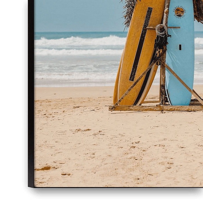 Dieses Foto fängt die Essenz eines entspannten Surftages an einem tropischen Strand ein. Zwei bunte Surfbretter - eines in warmem Gelb, das andere in leuchtendem Blau - lehnen an einem Holzständer, der unter einem Strohdach aus Palmenblättern geschützt ist. Im Hintergrund rollen die Wellen sanft gegen den weichen Sand, während der klare…