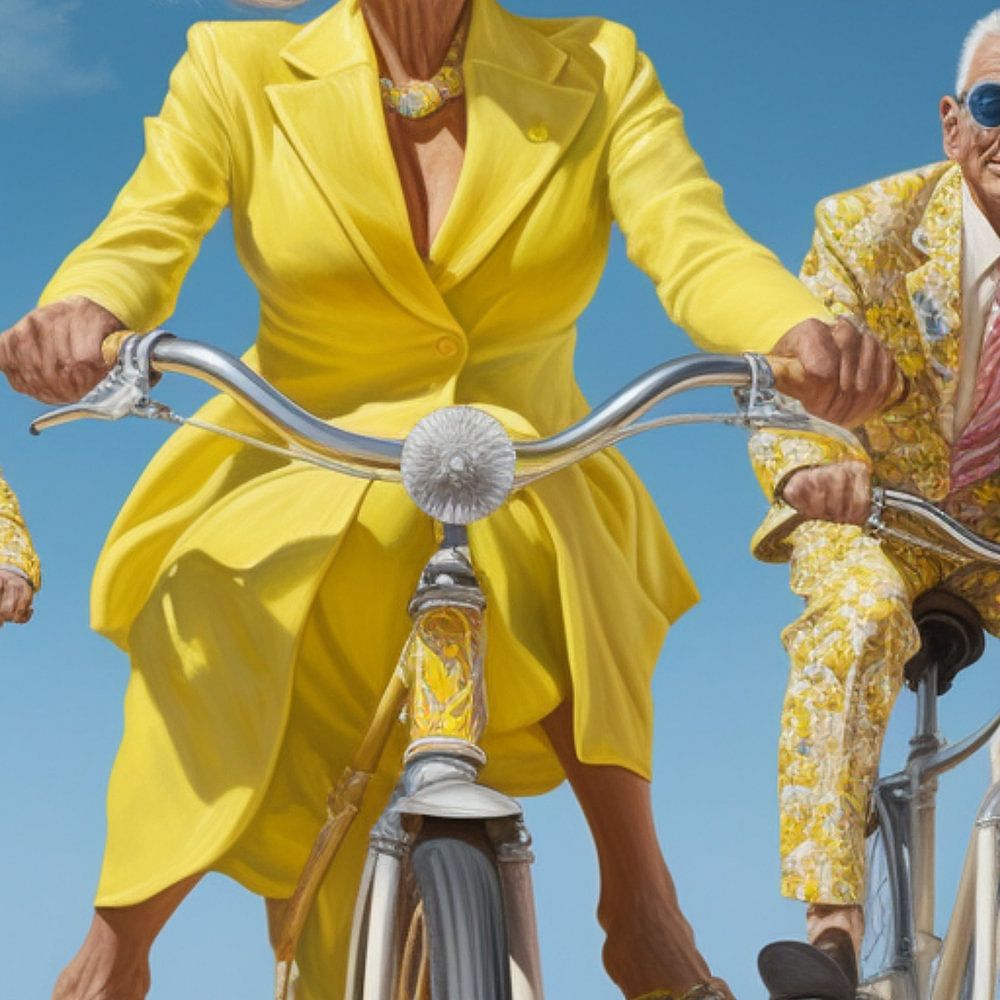 Dieses Bild zeigt eine dynamische Gruppe von drei Personen, die auf Fahrrädern durch eine weitläufige Sandlandschaft fahren. Die zentrale Figur, eine Frau, trägt ein leuchtend gelbes Kleid und einen passenden Blazer, der einen starken Kontrast zum blauen Himmel bildet. Ihr selbstbewusstes Lächeln und die gelbe Sonnenbrille strahlen Lebensfreude aus. Sie wird von zwei Herren flankiert, die ebenfalls in gelbe Anzüge gekleidet sind, was dem Bild eine skurrile, humorvolle Note verleiht. Ihr graues Haar und die Sonnenbrillen unterstreichen eine unkonventionelle Eleganz. Die Komposition feiert Individualität und die Freiheit im Alter.
