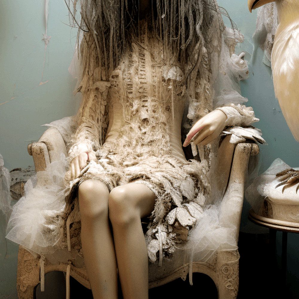 In einem verlassenen Raum mit abblätternder türkisfarbener Farbe sitzt eine Person in einem opulenten, zerlumpten Kleid auf einem reich verzierten Stuhl. Ihr langes, strähniges Haar ist mit kleinen Blüten geschmückt, und ihr Gesicht ist blass und ausdrucksstark, mit dunklen Augen. Neben ihr thront ein großer, weißer Vogel mit einem gelben Schnabel auf einem Sockel, während ein kleinerer weißer Vogel auf dem Boden zu ihren Füßen sitzt. Der Raum ist gefüllt mit Trümmern, zerfetzten Stoffen und verstreuten rosa Kugeln, die eine Atmosphäre von vergänglicher Schönheit und Verfall schaffen, die an ein verzaubertes, aber verfallenes Märchen erinnert.