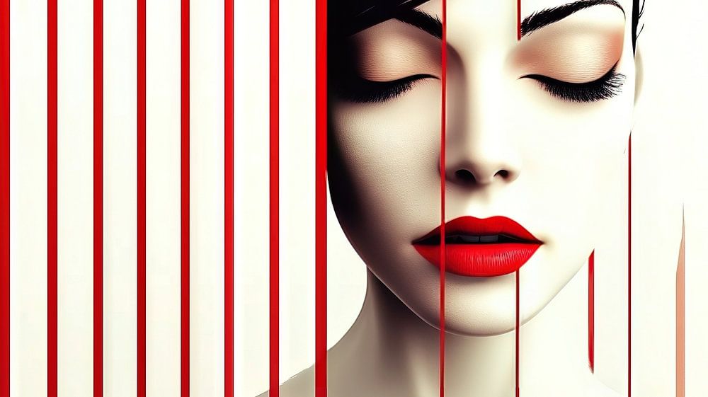 Ein surrealistisches Porträt einer Frau mit geschlossenen Augen und leuchtend rotem Lippenstift, die hinter einem Vorhang aus vertikalen roten Linien auf weißem Hintergrund posiert. Die Komposition schafft eine geheimnisvolle und abstrakte Atmosphäre, die den Betrachter in ihren Bann zieht.