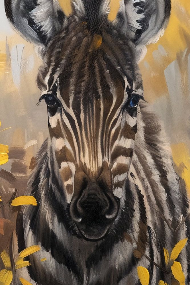Dieses wunderschöne Bild zeigt ein Zebra inmitten von herbstlichen Blättern. Das Design strahlt eine bezaubernde Mischung aus Realismus und Surrealismus aus und macht es zu einer einzigartigen Ergänzung für jedes Interieur. Die leuchtenden Farben des Zebras und die feinen Details machen dieses Kunstwerk zu einem echten Blickfang. Es eignet sich perfekt für ein Büro oder ein Schlafzimmer und bringt einen Hauch von Natur und Raffinesse in Ihre Umgebung. Der Kontrast zwischen dem Zebra und den warmen Tönen der Blätter erzeugt einen harmonischen und attraktiven visuellen Effekt, der jeden Raum verschönert.