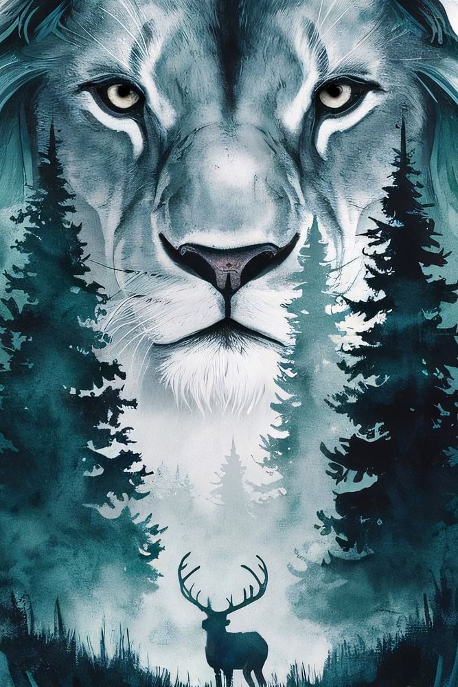 Dieses wunderschöne Kunstwerk zeigt eine surreale Darstellung eines majestätischen Löwen in Kombination mit einer ruhigen Waldlandschaft, in deren Mittelpunkt ein Hirsch steht. Der Künstler verwendet eine monochrome Palette von Blau- und Grüntönen, die dem Werk eine geheimnisvolle und bezaubernde Atmosphäre verleihen. Der kraftvolle und intensive Blick des Löwen in Kombination mit der ruhigen Umgebung des Waldes und der Silhouette des Rehs ergibt eine faszinierende und harmonische Komposition. Dieses Werk, das sich perfekt für Liebhaber der Tierkunst und des Surrealismus eignet, ist eine eindrucksvolle Ergänzung für jeden modernen Raum, wie z. B. ein Schlafzimmer oder ein Büro, wo es zweifellos Bewunderung hervorrufen wird.