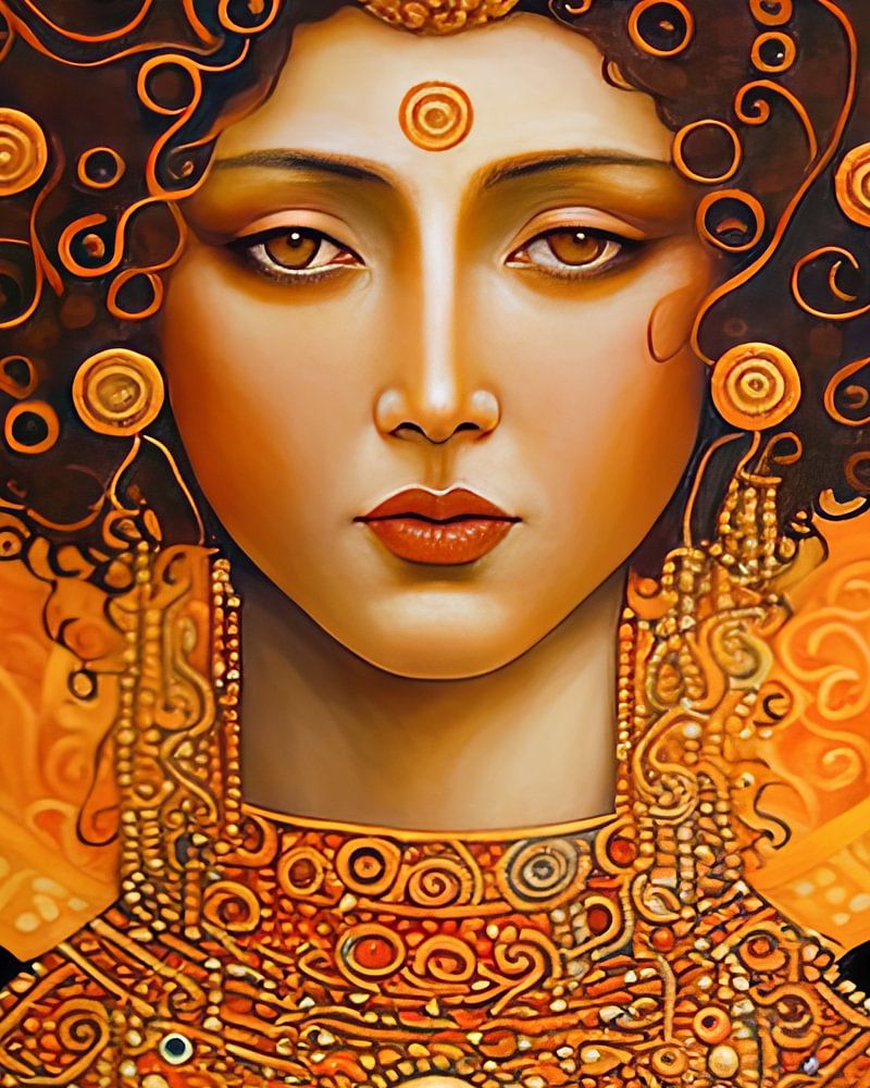 Dieses digitale Gemälde von Surya ist von dem berühmten Künstler Gustav Klimt inspiriert. Die in dem Gemälde verwendeten Farben, Muster und Formen sind typisch für den Stil von Gustav Klimt.