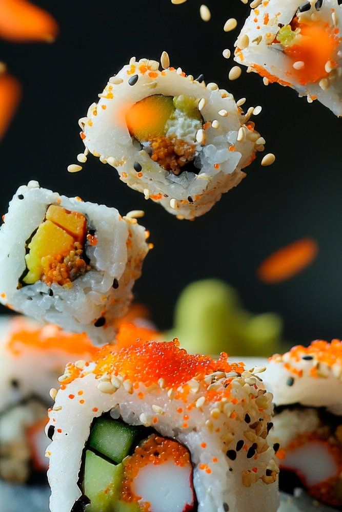 Ein kunstvolles Spiel von Farben und Texturen entfaltet sich in dieser dynamischen Sushi-Komposition, wo frische Zutaten in einem schmackhaften Tanz erstrahlen. Leuchtendes Orange von Flusskrebs und zarte Grünnuancen der Avocado harmonieren perfekt. Ideal für die Küche, wo Genuss und Kreativität aufeinandertreffen und zum Schlemmen einladen.