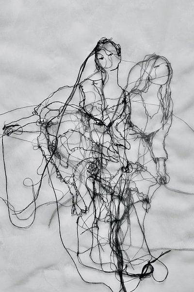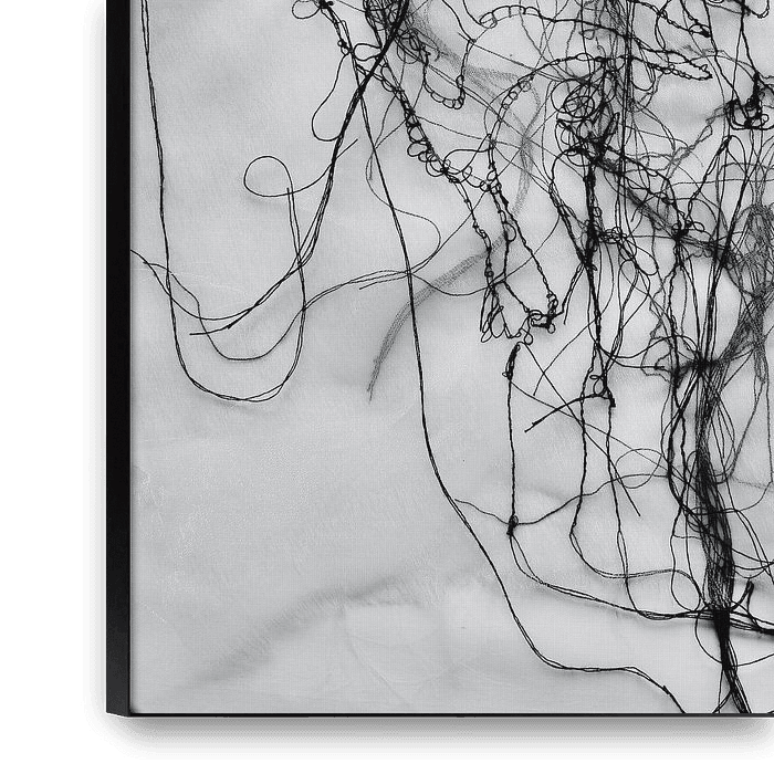 Eine doppellagige Fadenarbeit auf transparentem Stoff, zwei Figurationen bilden eine.