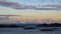 Einige Vögel fliegen vorbei vor der wundersamen Kulisse verschneiter Berge in der goldenen Abendsonne, gesehen von Svolvær auf der Inselgruppe Lofoten in Nordnorwegen.