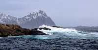 Eine raue See umspült die Küste der Lofoten bei Svolvær, Norwegen.