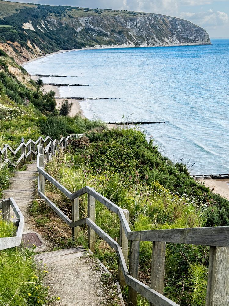 Küstenlandschaft an der Swanage Bay bei Swanage, Dorset, England.