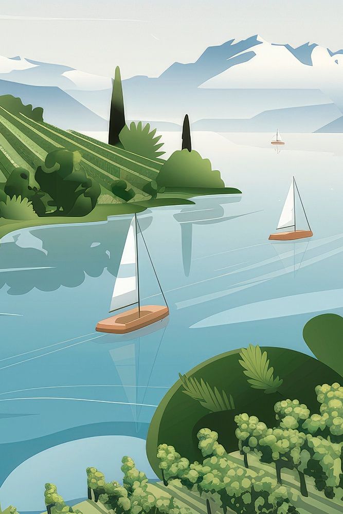 Mit sanften Hügeln und kristallklarem Wasser entfaltet sich die idyllische Landschaft der Schweiz. Segelboote gleiten über den ruhigen See, während majestätische Berge den Horizont zieren. Diese harmonische Komposition bringt Ruhe und Gelassenheit ins Schlafzimmer, ideal für entspannende Stunden voller Träume von fernen Abenteuern.