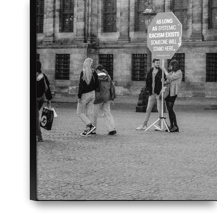Dieses Schwarz-Weiß-Foto wurde auf dem Dam-Platz in Amsterdam aufgenommen. Zwei Personen stehen neben einem Schild mit dem Text: "Solange es systemischen Rassismus gibt, wird jemand hier stehen".