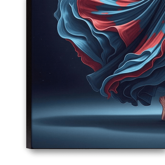 Eine Tänzerin in einem blauen und roten Kleid mit wallendem Rock tritt vor einem dunkelblauen Sternenhintergrund auf.