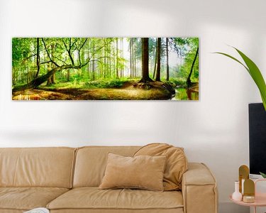 Atemberaubende Szene in einem märchenhaften Mischwald. Das helle Sonnenlicht fällt durch den Nebel auf eine Lichtung. Rechts im Bild ein kleiner Bach. Der Waldboden ist mit Moos, Gräsern und etwas Herbstlaub bedeckt. Im Hintergrund viele Fichten und einige Laubbäume.