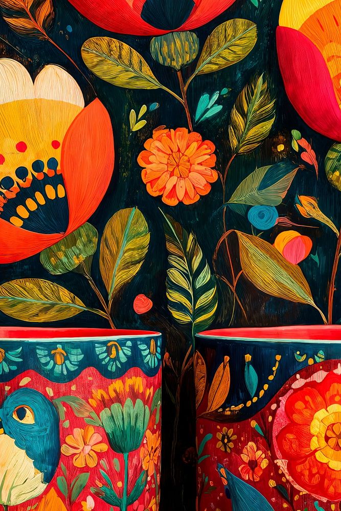 Ein lebhaftes Stillleben mit zwei reich verzierten Keramikbechern, inspiriert von der Volkskunst aus Talavera. Talavera ist eine handgefertigte, handbemalte und glasierte Keramik aus Mexiko, die tief in der spanischen Kolonialtradition verwurzelt ist. Sie zeichnet sich durch lebendige Farben und komplizierte Muster aus und wird häufig…