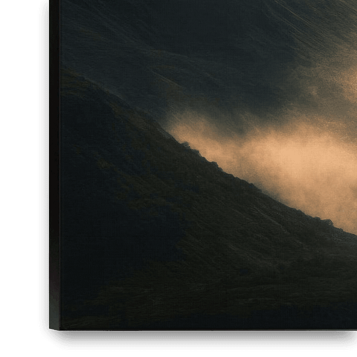 Ein sanfter Fluss schlängelt sich durch majestätische Berge, eingehüllt in einen mystischen Nebel. Die goldenen Lichtstrahlen der untergehenden Sonne tauchen die Szenerie in ein warmes, beinahe magisches Licht. Geheimnisvolle Schatten tanzen in den Tälern, während die Schönheit der Natur uns in eine friedliche, träumerische Welt entführt.