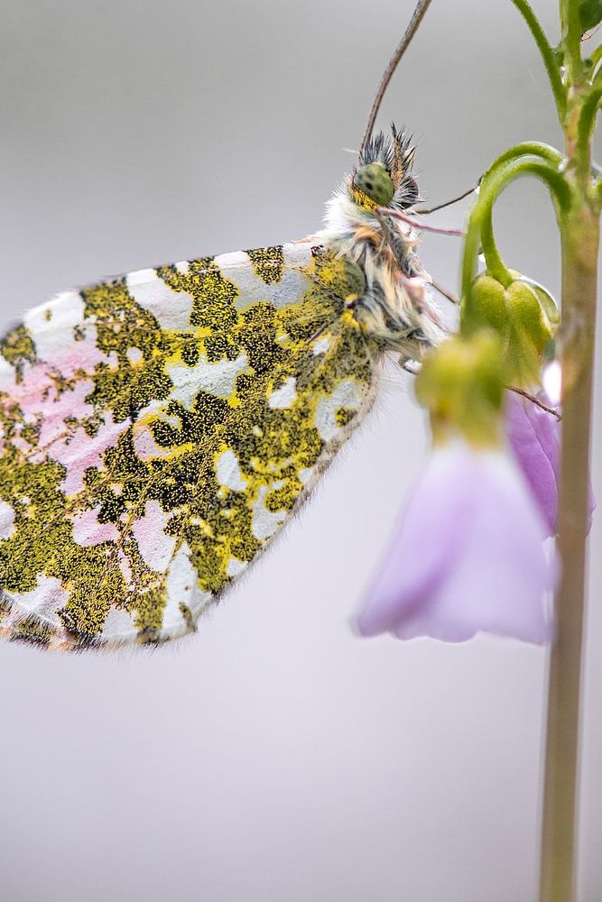 Der Orangenspitz mit seinen auffälligen orangefarbenen Flügelspitzen ist ein Schmetterling, der die zerbrechliche Schönheit und das Erwachen einer neuen Jahreszeit symbolisiert. Die Kuckucksblume ist seine Lieblingsblume, sowohl als Ort der Ruhe als auch als Nahrungsquelle. Dieses Bild zeigt ihre Begegnung in einem stillen Tanzmoment - eine Choreografie der Leichtigkeit und des Details.