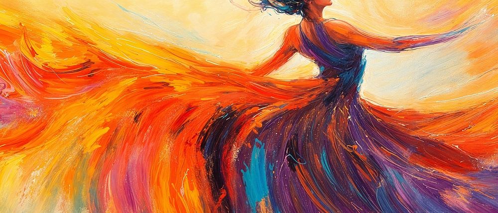 Inmitten leuchtender Farben entfaltet sich eine dynamische Tanzszene, in der die Bewegung förmlich spürbar ist. Die harmonische Verbindung von Orange, Lila und Blau erzeugt eine Atmosphäre der Freiheit und Kreativität. Ideal für ein Wohnzimmer, das mit Energie und Leben erfüllt werden soll, lässt dieses Kunstwerk die Herzen höher schlagen.