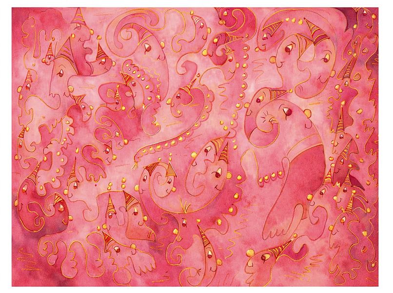 Bestelle diese Illustration Tanz der Herzenswesen von Renate Sell als Kunstdruck auf Leinwand, Alu-Dibond, als Poster, Fototapete oder Acrylglasbild.