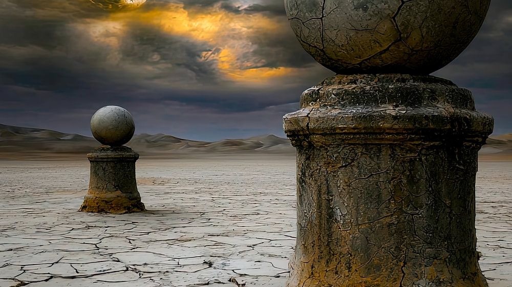 In einer unendlich scheinenden Ödnis ragen auf seltsam anmutenden Sockeln mehrere sphärische Gebilde empor. Ihr rissiges Gestein scheint von langer Dürre und großem Druck gezeichnet, als hätten vergangene Zeitalter tiefe Spuren hinterlassen. Der ausgedorrte Untergrund bildet ein feines Mosaik aus zerklüfteten Fragmenten, während ein dramatischer Himmel die Szene in dämmeriges Licht taucht. Im Hintergrund funkelt ein überdimensionaler Mond, dessen goldene Schimmer das trostlose Land ein wenig zu wärmen scheinen.