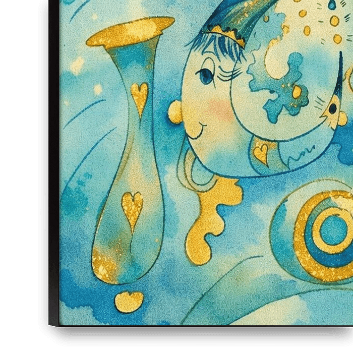 In einem sanft fließenden, türkisblauen Zauberstrom erwachen Zahlen zum Leben und beginnen ihren fröhlichen Tanz. Jede Zahl trägt ein eigenes Gesicht, eine eigene Stimmung – mal verträumt, mal neugierig, mal verschmitzt lächelnd. Goldene Lichtakzente glitzern wie kleine Sonnenfunken auf ihren Formen und verleihen der Szene eine warme,…