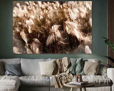 Ein Feld aus wehendem Flaum fängt das sanfte Abendlicht ein. Jeder Halm trägt ein Bündel weißer Fasern, die so leicht sind, dass sie auf ihrem eigenen Atem zu schweben scheinen. Das Bild vibriert vor Bewegung, als würde ein sanfter Traumwind die Erde streicheln und das Gras in einen Tanz aus Licht und Luft verwandeln.