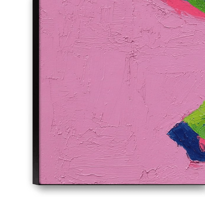 Dancing with Colours - Dieses Gemälde zeigt einen energiegeladenen Tanz zwischen einem Mann in einem weißen Mantel und einer Frau in einem grünen Kleid, der in leuchtenden Farben vor einem rosafarbenen Hintergrund dargestellt ist und eine spielerische und fröhliche Atmosphäre hervorruft.