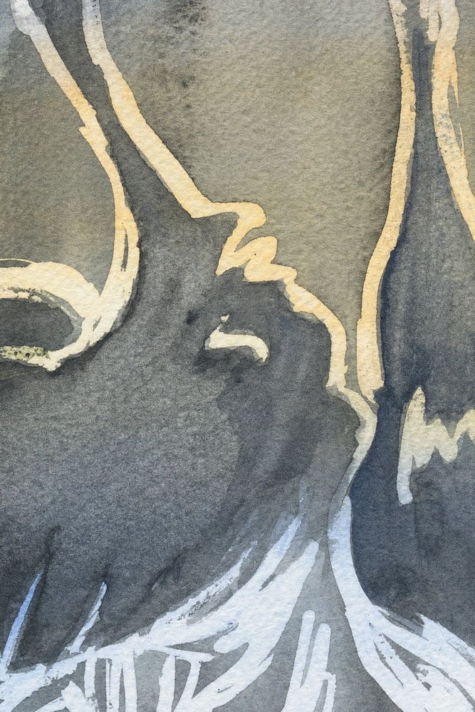 Graues, gelbes und blaues Aquarell, inverse Technik, auf Aquarellpapier von sibirischen weißen Kranichen