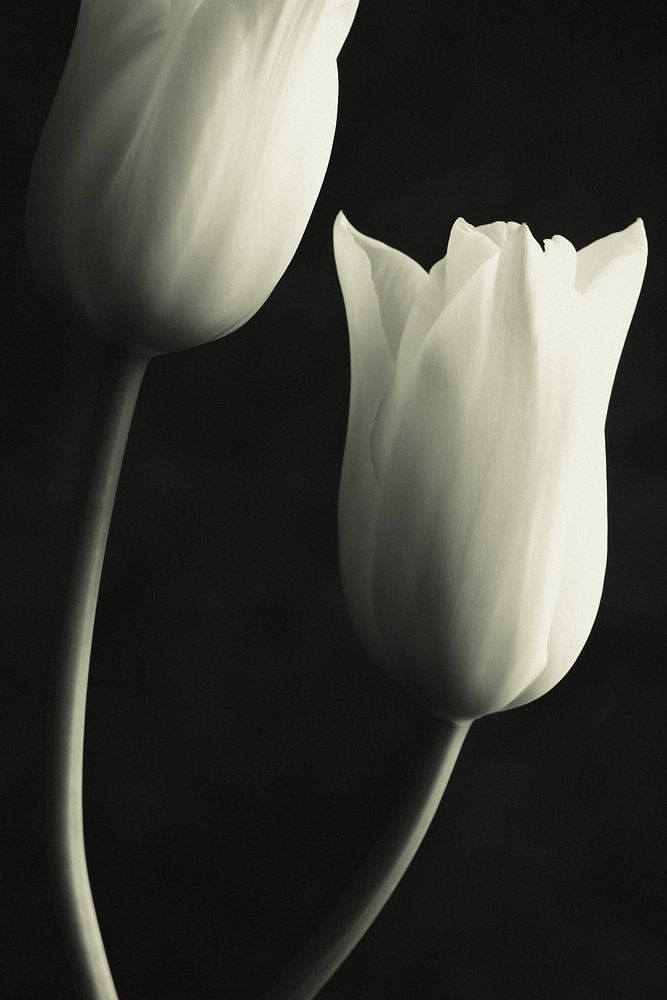 Zwei weiße Tulpen tanzen umeinander. Werfen Sie einen Blick auf meine anderen Werke, in denen ich mehr Tulpen mit Delfter Blau fotografiert habe