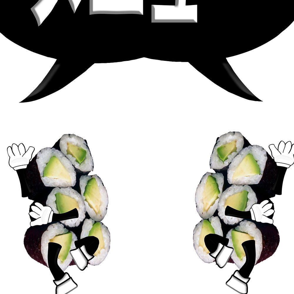 Tanzender Sushi-Cartoon mit Sprechblase "Menü" 「メニュー」と書かれた吹き出し付きの踊る寿司漫画メニュー