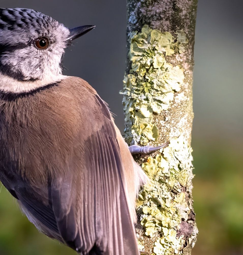 Auf einem dünnen Ast saß eine Haubenmeise. Das Sonnenlicht fiel sanft auf ihren markanten Kopf und ließ jede einzelne Feder glänzen, als würde sie sanft von der Sonne geküsst. Ihre Augen blickten neugierig umher, wachsam und lebhaft, während sie einen Moment lang still in einem Moment reiner Ruhe zu verweilen schien. Die Kombination aus seiner anmutigen Körperhaltung und dem sanften Licht verwandelte eine einfache Szene in etwas fast Magisches; ein kleines Stück Natur, das in seiner Einfachheit und Schönheit erstrahlte.