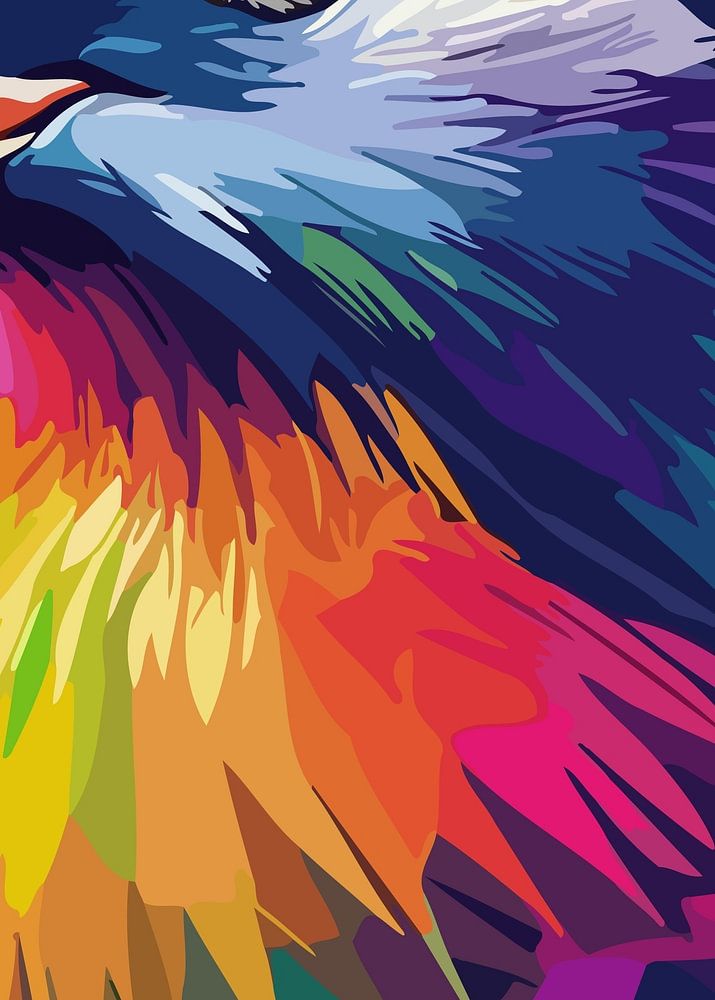 Diese Pop-Art-Taube wurde mitten im Flug eingefangen und schwebt über eine Leinwand mit abstrakten Farbspritzern und geometrischen Formen. Neontöne in Magenta, elektrischem Blau und sonnigem Orange heben ihre Flügel hervor und zelebrieren die Widerstandsfähigkeit und Anpassungsfähigkeit der Taube mit einer modernen, künstlerischen Note.