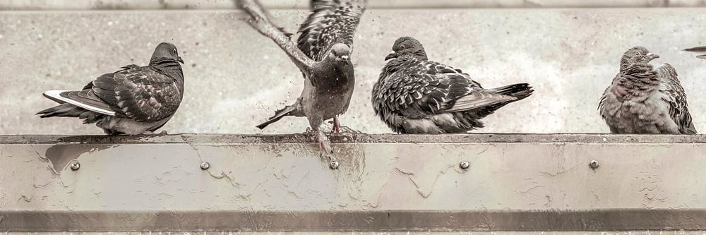 Die Tropfen fliegen dann in alle Richtungen, und manche Tauben sehen dadurch verstört aus.