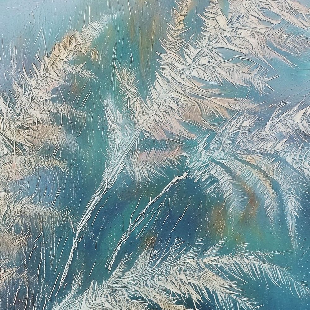 Zarte und poetische Interpretation von flauschigen Pflanzen, Pampasgras, vor einem Hintergrund aus sanften Pastellfarben. Die in Silber-, Weiß- und Goldtönen auf einer blauen und türkisfarbenen Leinwand gemalte Szene spielt mit Licht und Textur, um eine verträumte Atmosphäre zu schaffen. Die Pflanzen sind mit einer fast impressionistischen Technik gemalt, wobei die Details der einzelnen Federn verblasst sind und mehr andeuten als definieren.