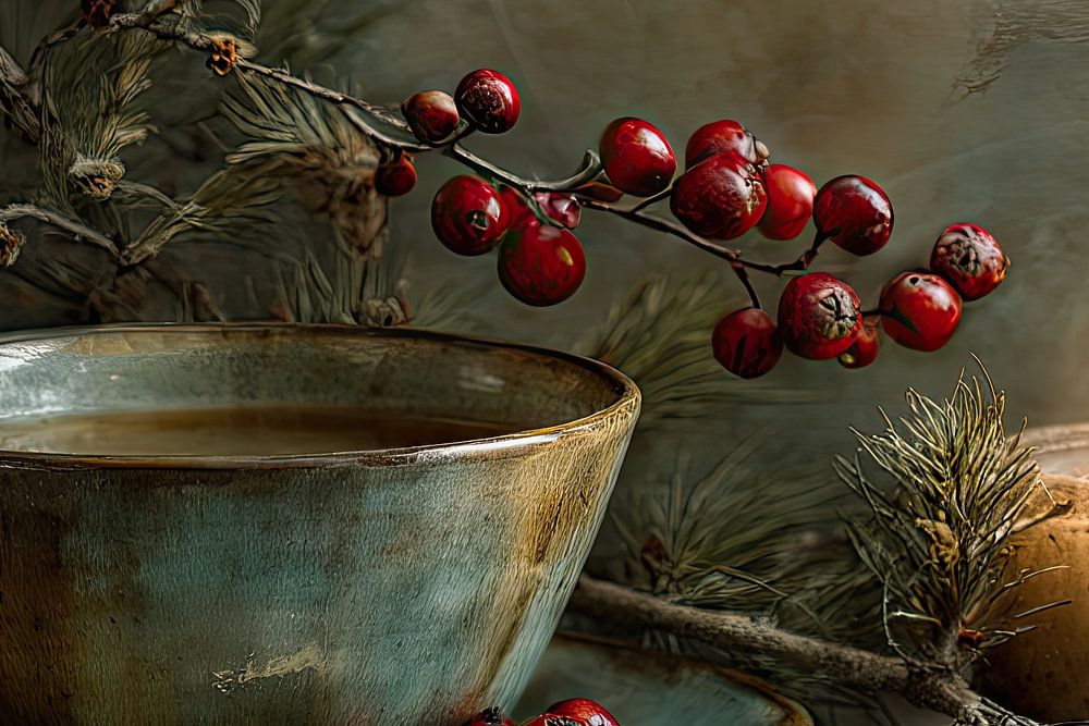 Ein stimmungsvolles Gemälde mit einer grünen Teetasse, roten Beeren und einer brennenden Kerze strahlt Wärme und Behaglichkeit aus. Eine zeitlose Szene, die winterliche Gemütlichkeit und poetische Intimität vermittelt.
