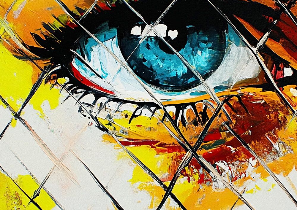 Tennisgemälde mit Netz - Dieses Tennisgemälde zeigt eine Nahaufnahme eines entschlossenen Blicks mit einem strahlend blauen Auge und einem charakteristischen Netz, das die Atmosphäre des Sports heraufbeschwört.