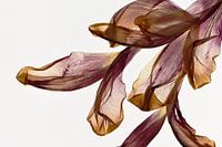 Ursprünglich war diese Tulpe rot und verjüngte sich zu gelb, aber nach dem Trocknungsprozess nahmen die Blätter eine tiefere ockerfarbene, terra- bis fast bordeauxfarbene Farbe an. Dies verleiht diesem Kunstwerk eine warme Farbpalette.