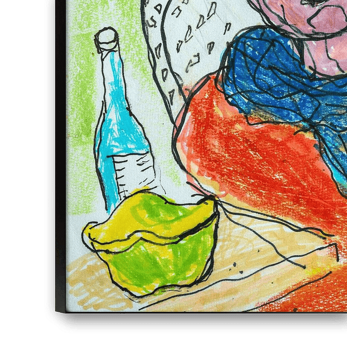 Die Figur ist in warmen Orange-, Gelb- und Rosatönen gehalten, die durch die kühlen Blautöne des Schals und der Flasche auf dem Tisch ergänzt werden. Der leuchtend grüne Hintergrund unterstreicht die sonnige, ungezwungene Atmosphäre der Terrasse. Die Details sind absichtlich ungleichmäßig, manchmal fast karikaturistisch, wodurch die Zeichnung leicht, fröhlich und spontan wirkt.