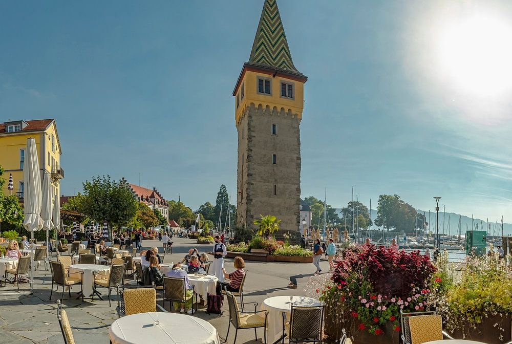 Terrassen an der Seepromenade, Mangturm, der Hafen, Lindau, Bodensee, Bayern, Deutschland