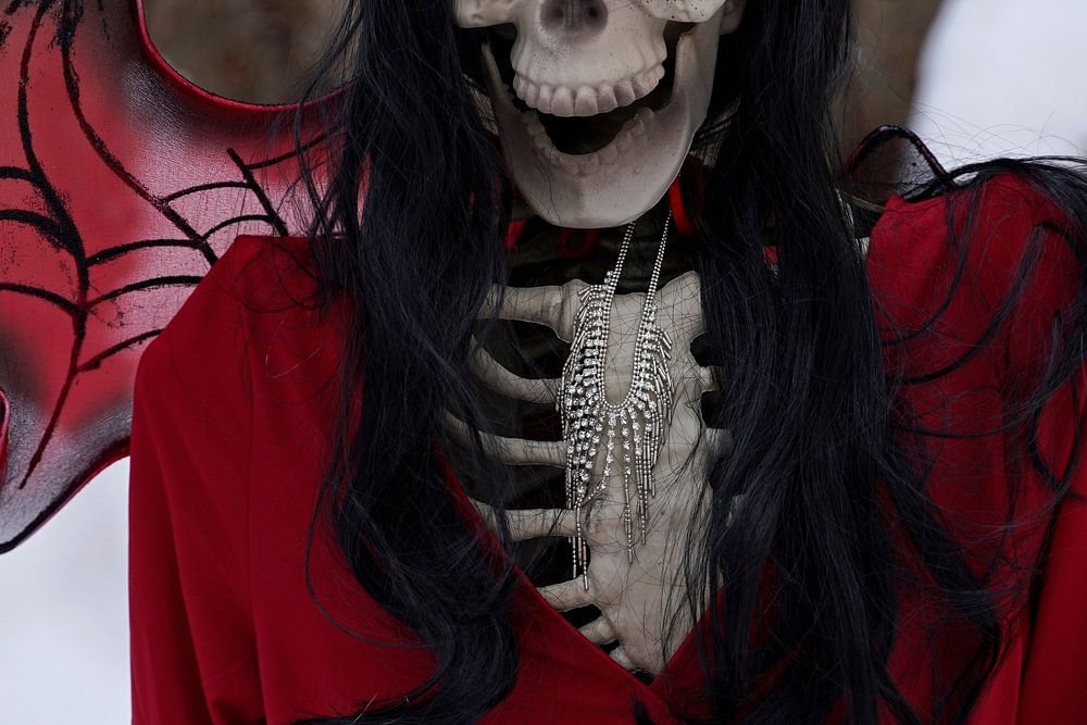 Teufelsbraut Skelett mit rotem Kleid und Teufel Flügel im Schnee