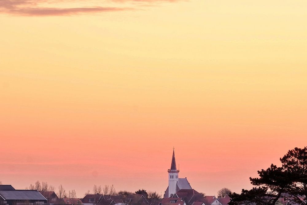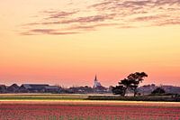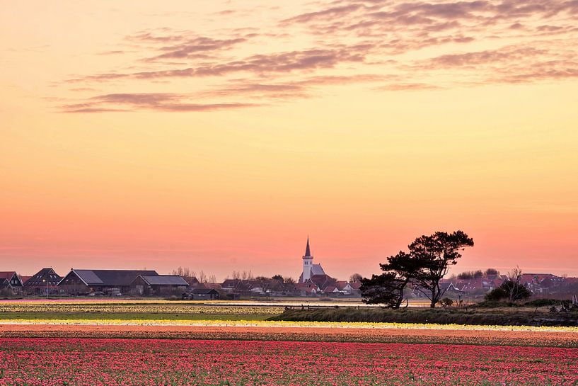 Texelkirche Den Hoorn bei Sonnenaufgang mit blühenden Tulpenfeldern im Vordergrund