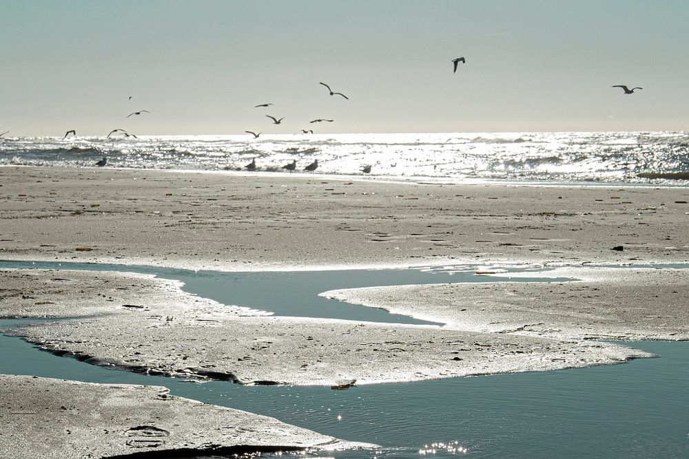 Dies ist ein wunderschönes Bild vom Strand von Texel, wo man die Dynamik der Natur sehen und spüren kann. Der Strand verändert sich ständig unter dem Einfluss von Ebbe und Flut, die Spuren im Sand hinterlassen. Man kann sehen, wo Menschen spazieren gegangen sind, wo Muscheln angeschwemmt wurden und wo sich Wasser in glitzernden Pfützen gesammelt hat. Dieses Bild regt die Fantasie an, weil es ein Gefühl von Weite, Freiheit und Ruhe vermittelt. Man kann sich im Horizont verlieren, wo der Himmel auf das Meer trifft. Man kann auch die Möwen bewundern, die den Reichtum des Meeres nutzen und ihre Flügel im Wind ausbreiten. Ein Bild, das Sie so schnell nicht vergessen werden, denn es zeigt Ihnen, wie schön und vielfältig der Strand von Texel ist.