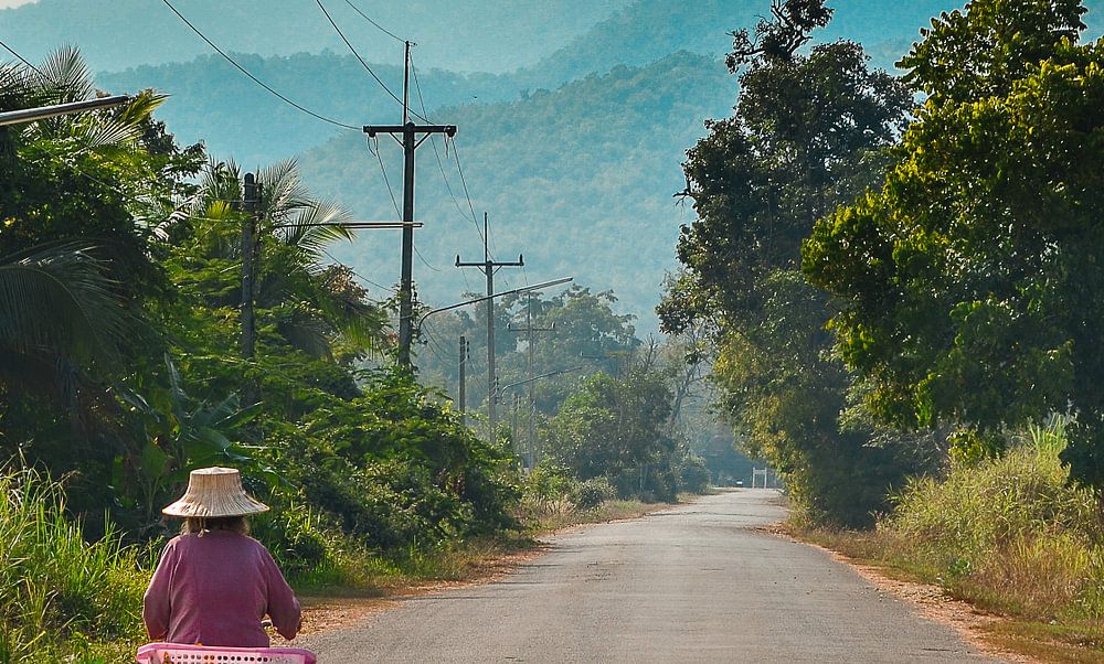In der Nähe der alten Hauptstadt Sukhothai radelt eine Thailänderin nach Hause, nachdem sie den ganzen Tag an den Ruinen im Historischen Park verkauft hat. In der Ferne die Berge des Nordens von Thailand.
