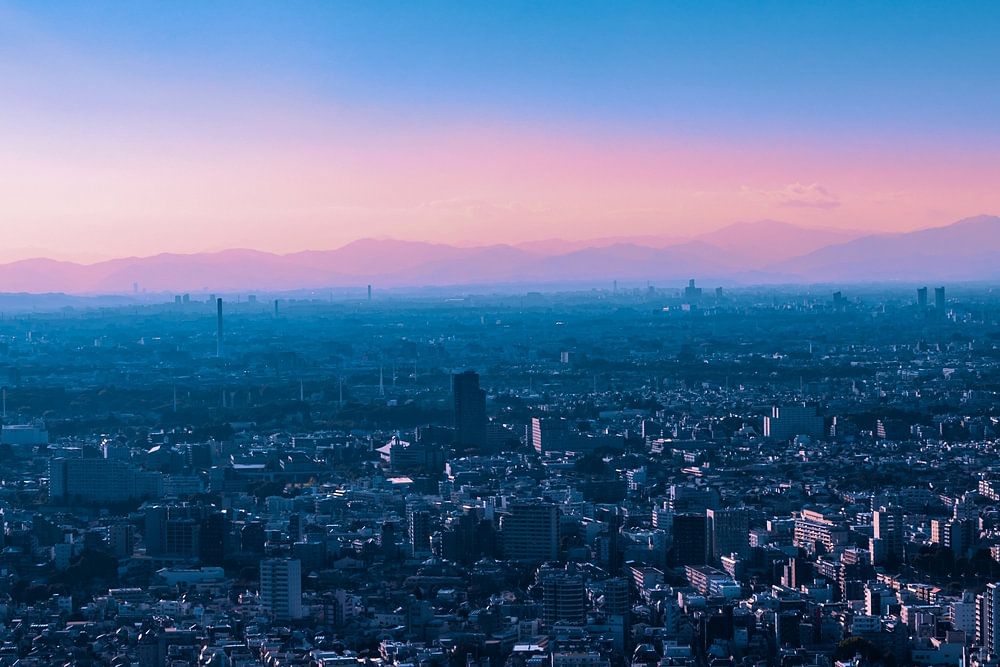 Ein Sonnenuntergang über einem Teil von Tokio vom Regierungsgebäude in Shinjuku in Japan.